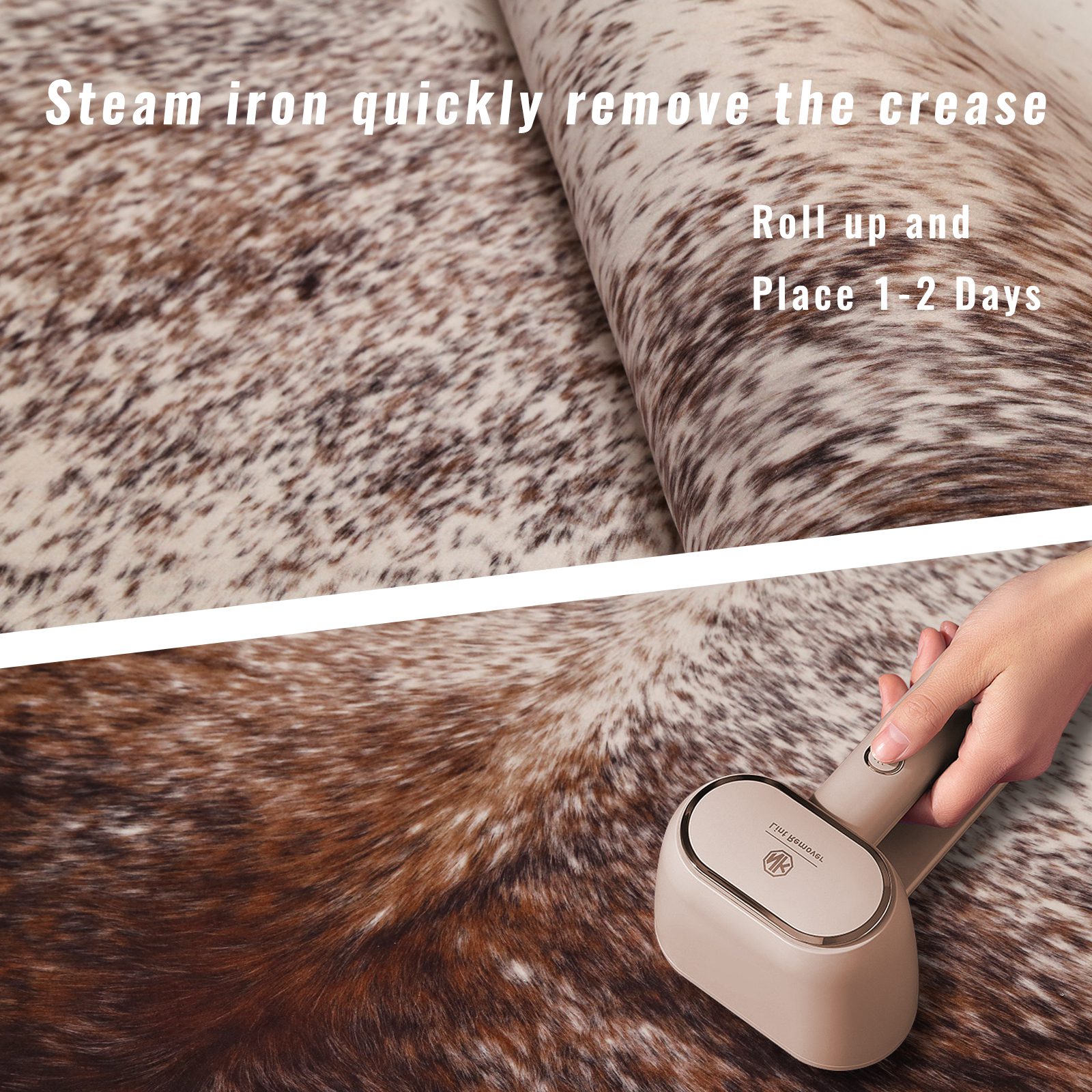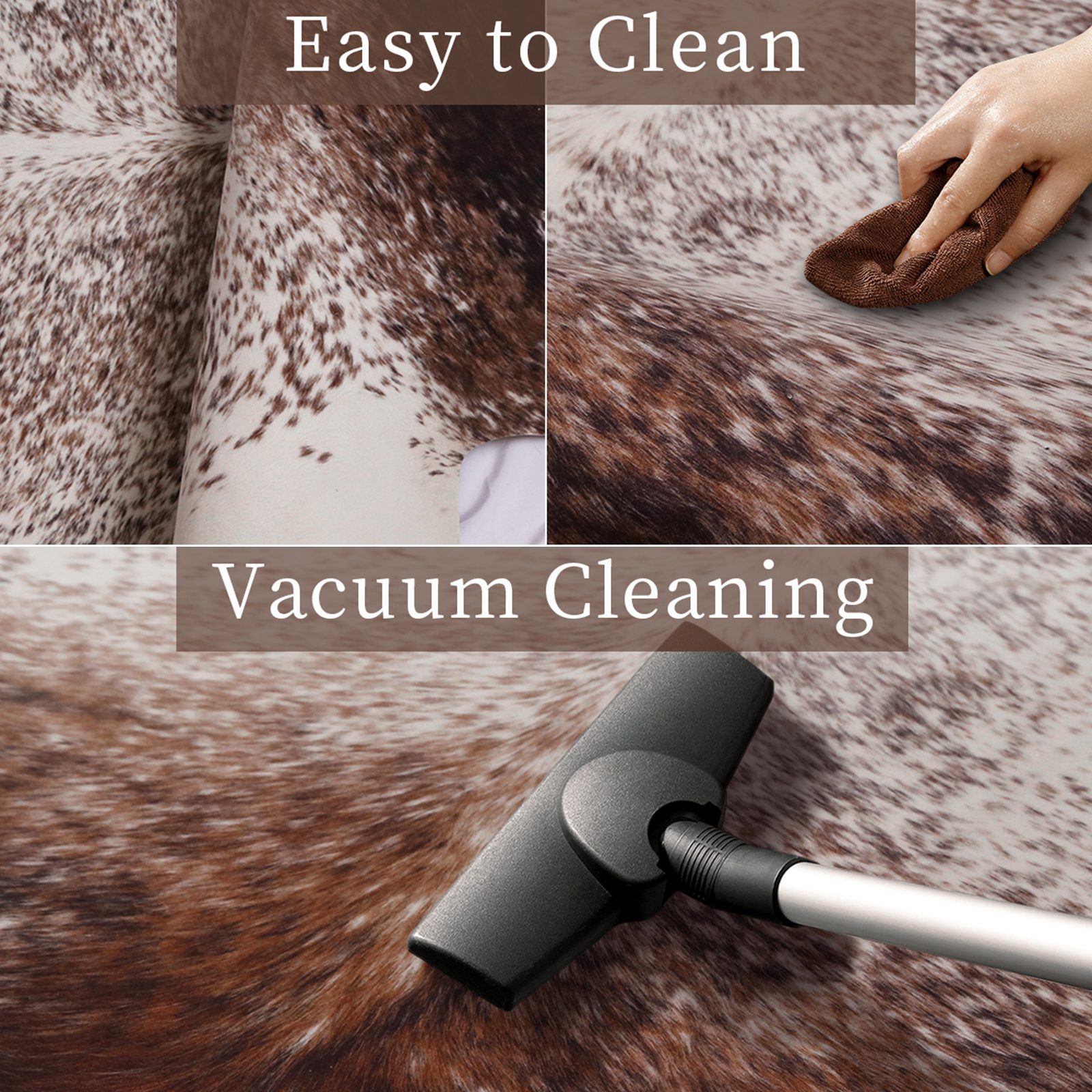INSTRUCTIONS D'ENTRETIEN : Secouer le tapis de fourrure à l'extérieur permet d'éliminer une grande partie de la saleté ; ce tapis imprimé en peau de vache est lavable en machine, il suffit de le mettre dans la machine à laver pour le nettoyer.
