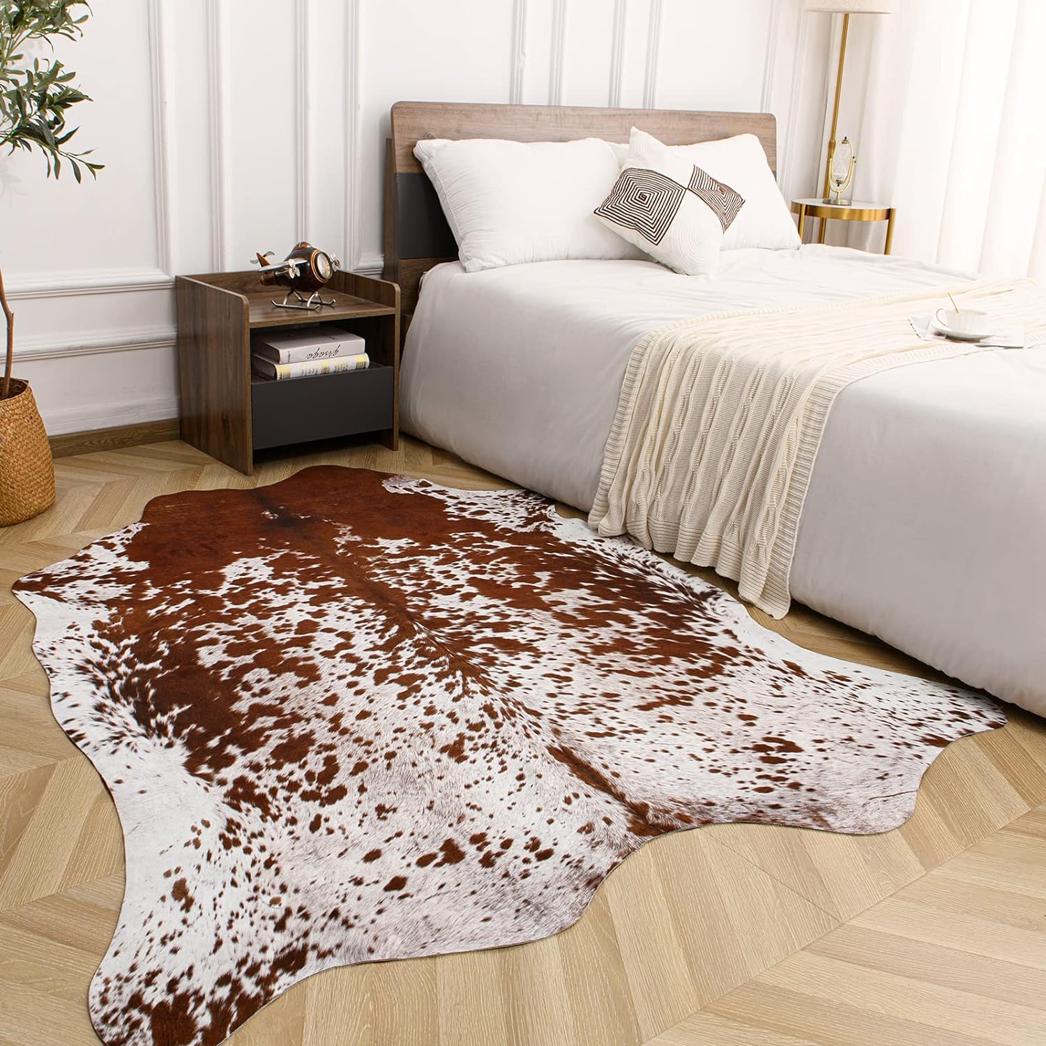 Tapis en fausse peau de vache de première qualité : Fabriqué à la main avec des tons riches et naturels et un toucher doux, il ajoute une touche de charme occidental à votre salon ou à votre chambre.